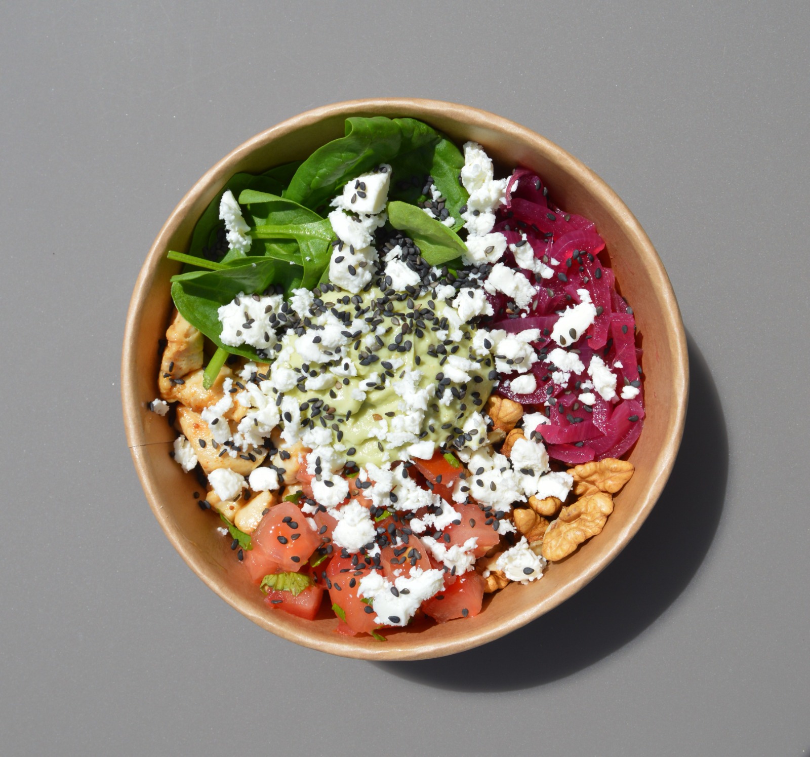 30 gr de quinoa, 150 gr de patate douce bio, 90 gr de poulet bio, épinards, pickels d’oignon rouge, noix, tomate, crème d’avocat, sésame, 20 gr de feta