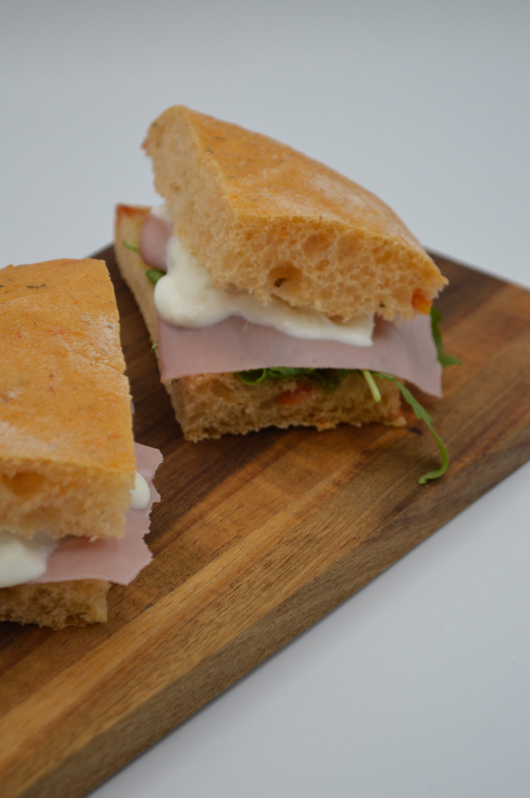 foccacia, stracciatella, mortadelle, roquette, pesto
