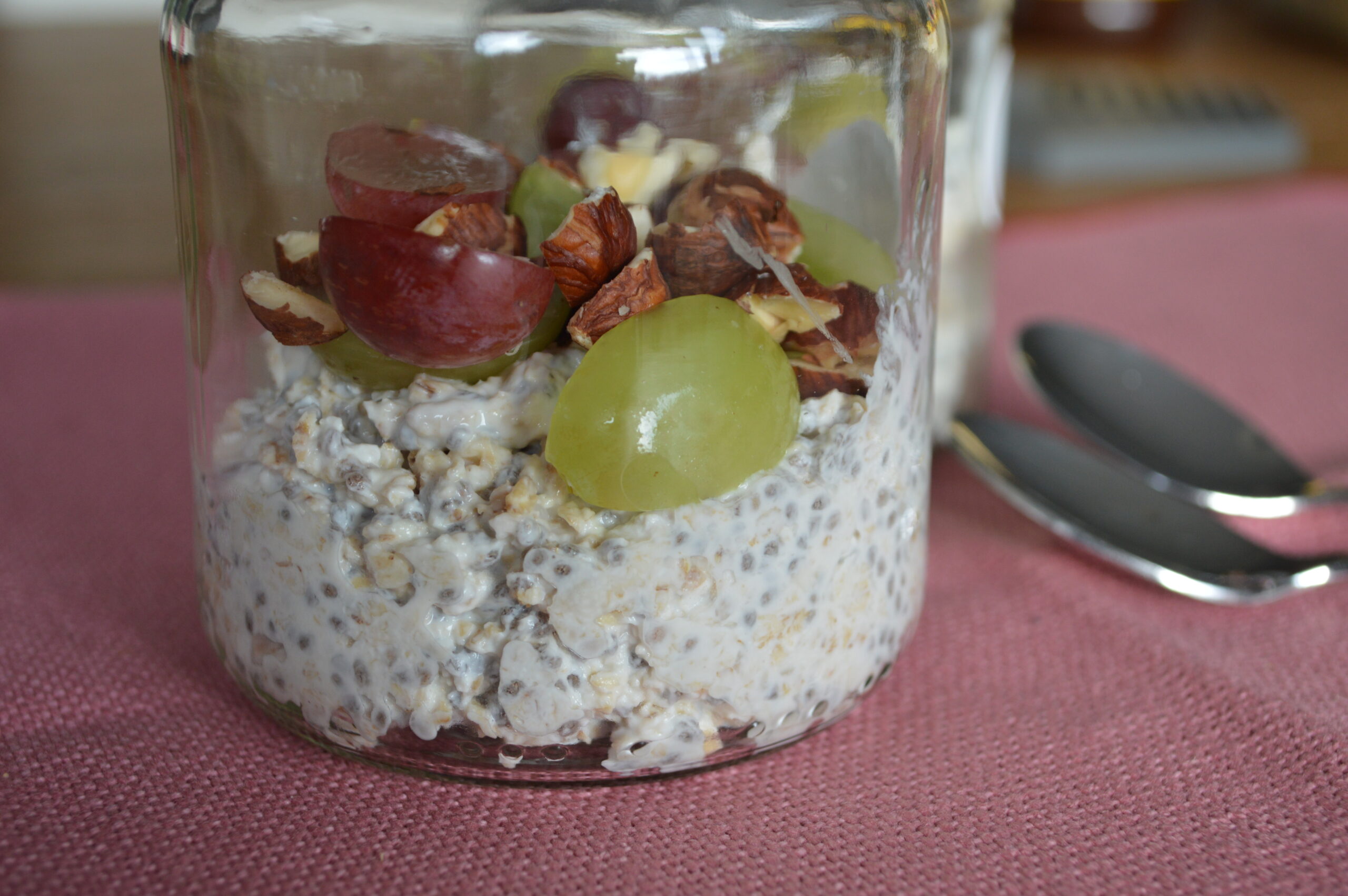 flocons d’avoine, graine de chia, yaourt, lait d’avoine, noisette, raisin, sirop d’agave