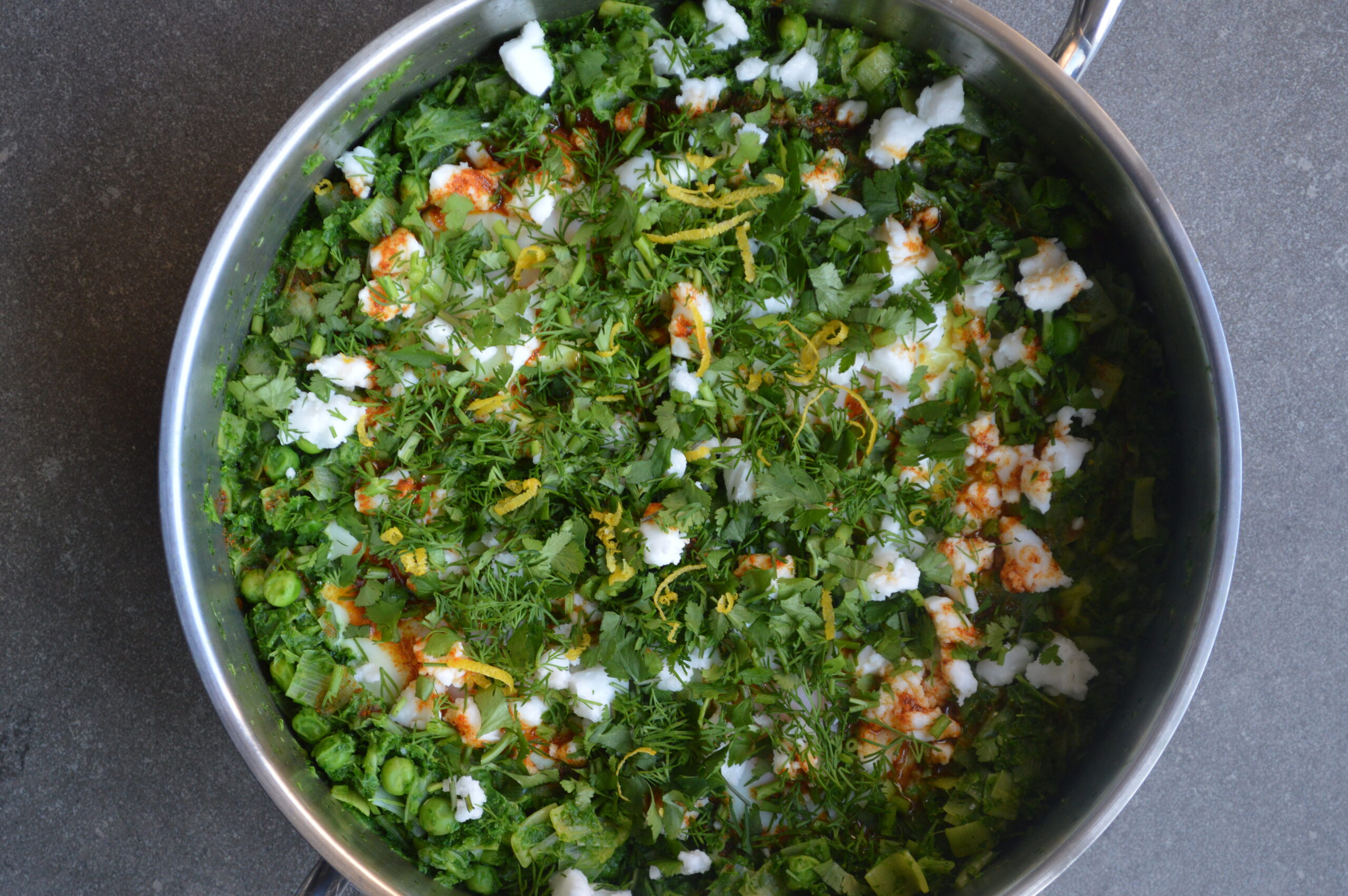 100 gr de chou kale, 1/2 poireau, petits pois, 2 œufs, feta, ail, paprika, aneth, coriandre, citron