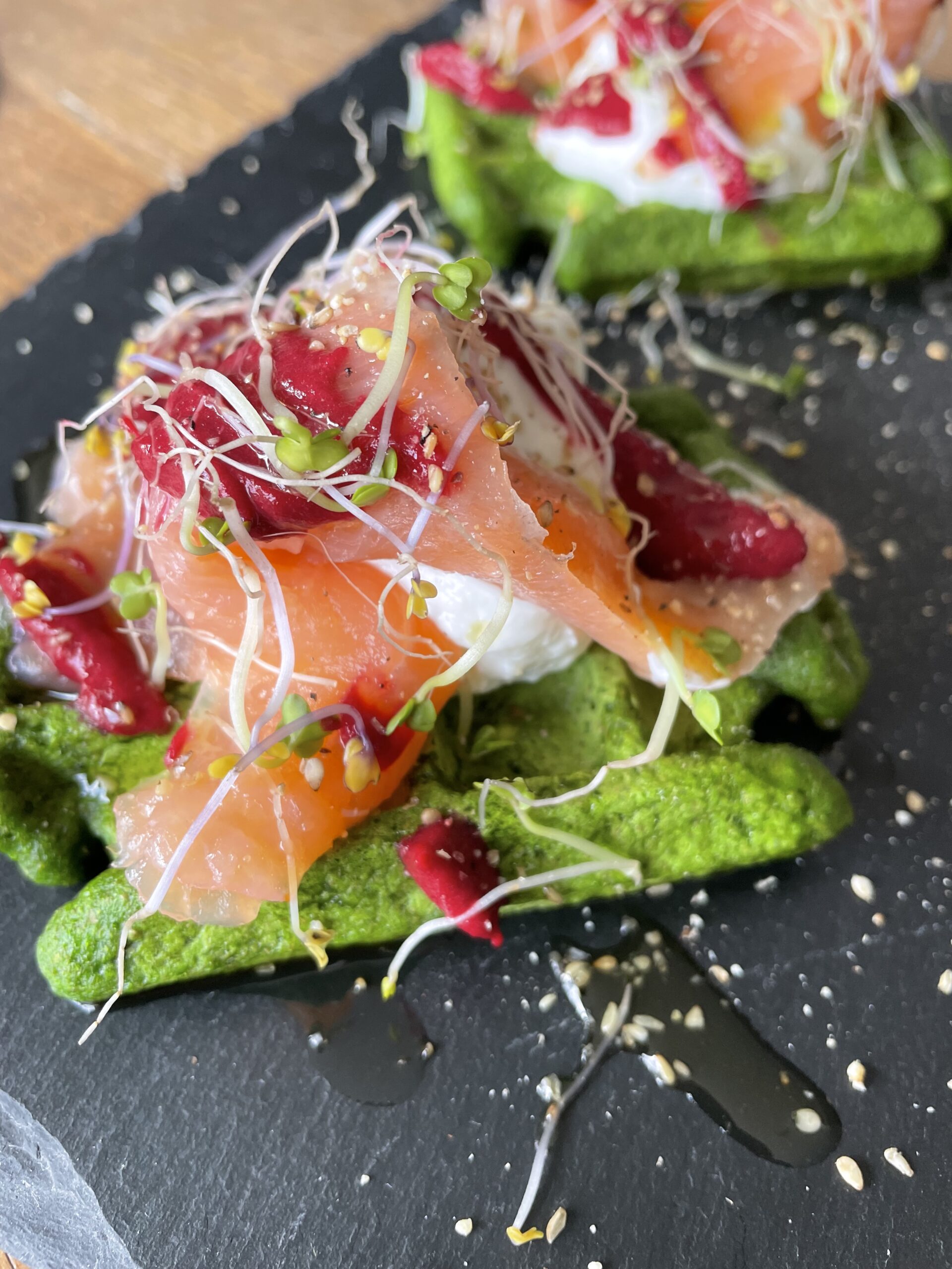 2 gaufres aux épinards, saumon fumé