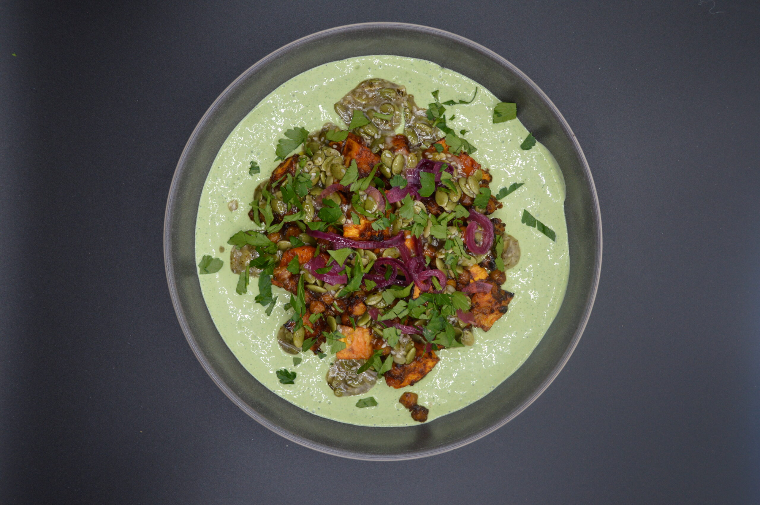 125 gr de patate douce, pois chiches, oignon rouge, miso, 50 gr de yaourt, tahini, feta vegan, fines herbes, citron