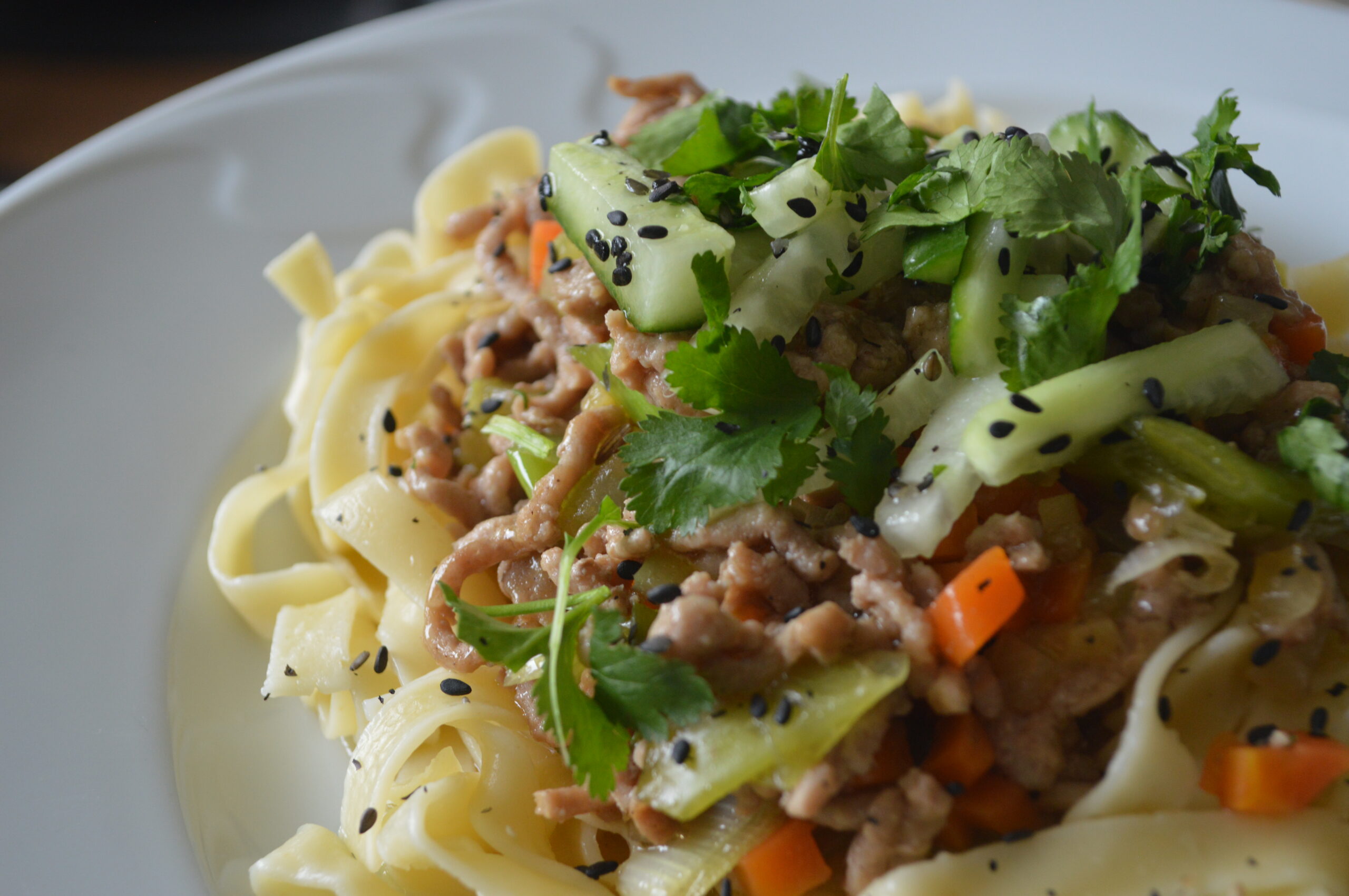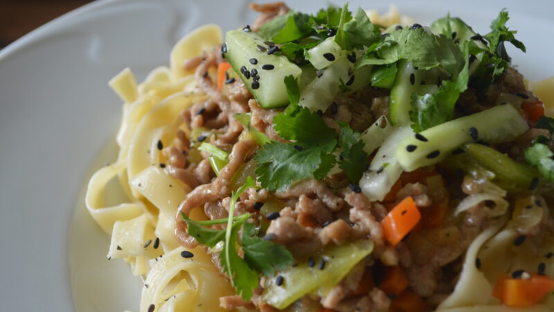 Ingrédients: porc, pâtes, carotte, céleri, oignon, ail, cébette, concombre, cannelle, laurier, graine de fenouil, gingembre, vin de Shaoxing, tamari bio, huile d’olive bio, huile de sésame, vinaigre de riz, miel bio, maïzena, coriandre, sésame (allergènes: gluten, céleri, soja, sésame)