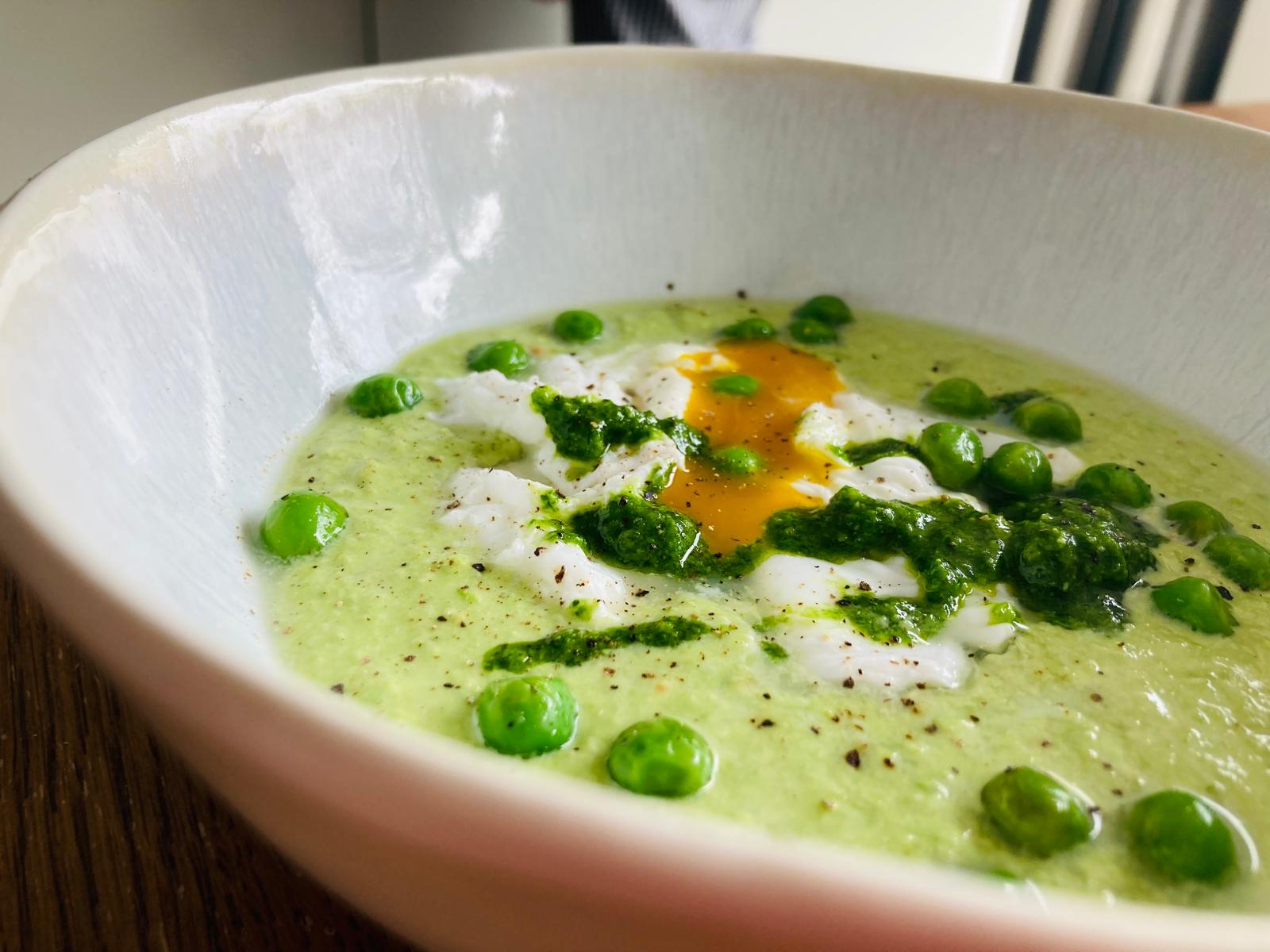 Œuf poché, crème de petit-pois et ail des ours